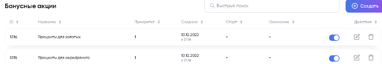 После перехода клиента на уровень «**Серебряный**», система должна изменить % начисления с базового 5% на 10%. Для этого необходимо создать акцию.