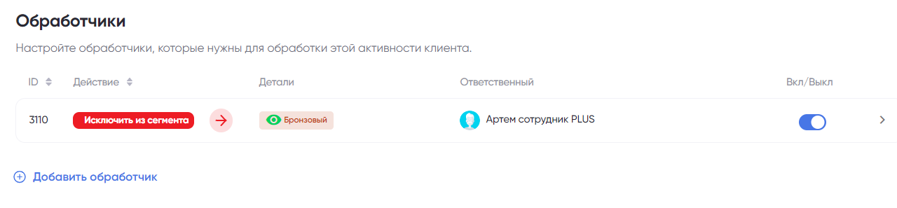 На этапе «**Обработчики**» добавьте обработчик «**Добавить в сегмент**» и выберите бронзовый.