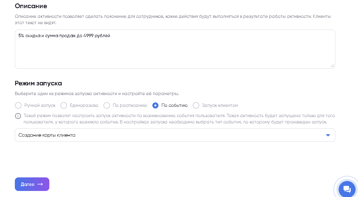 Создайте активность с названием «**Добавление в бронзовый уровень**» и установите режим запуска «**По событию**» и выберите событие «**Создание карты клиента**». Нажмите на кнопку «**Далее**».