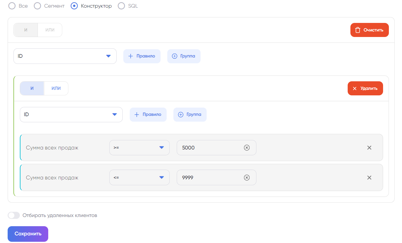 На этапе «**Отбор клиентов**» вставьте конструкцию из группы правил по сумме продаж: