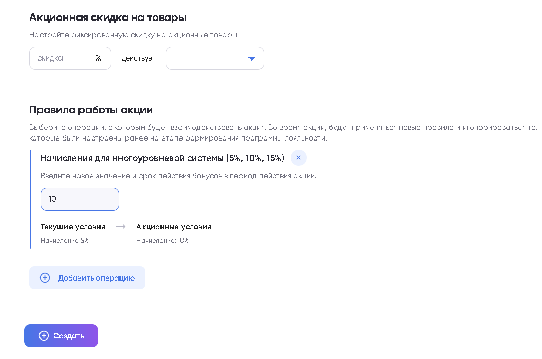 Чтобы поменять базовый процент бронзового уровня настройте правила работы акции и нажмите на кнопку «**Создать**». Акционную скидку на товары не устанавливаем, так как по условиям программы у бронзового и серебряного уровней дисконтной скидки нет.