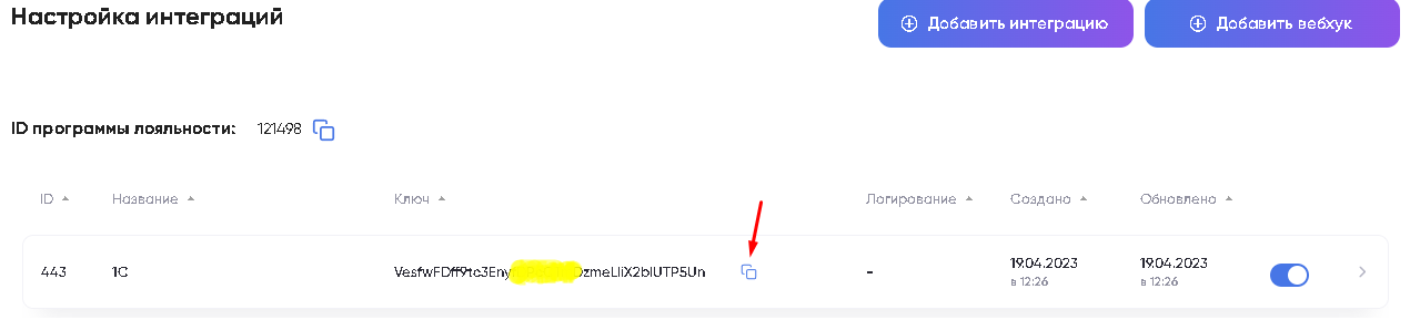 Ключ интеграции будет выдан автоматически. Рядом с ключом расположена кнопка копирования ключа в буфер обмена для вставки его в стороннее программное обеспечение, с которым производится интеграция.